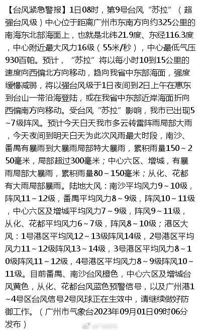目前番禺、南沙臺風橙色,中心六區及增城臺風黃色,從化、花都臺風藍色預警信號,以及廣州港1~4號區臺風信號2號風球正在生效中,請繼續做好防御工作。