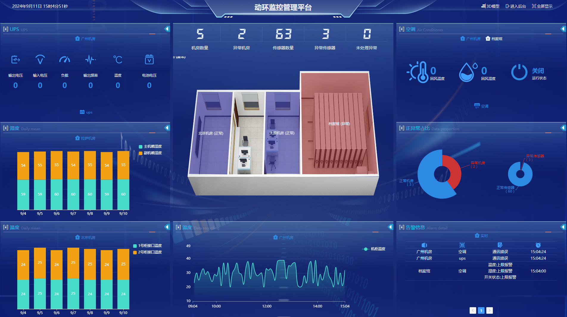 5、環境系統: 精密空調、泄漏、溫度、濕度、新風機、氣體、塵埃;精密空調:監測回風溫度/濕度等參數,壓縮機、風機、加濕器、去濕器等部件的狀態,控制空調的啟停,調節溫度和濕度。普通空調:通過對其控制電路的分析,可實現對普通空調的狀態監測和啟??刂啤P嘛L機:新風機工作狀態監測以及啟停控制。溫濕度:監測各房間溫濕度傳感器所采集的溫度和濕度數據,并越限報警。