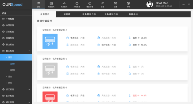 監控內容:機房溫度出現異常時,將導致機房其他設備運行所需的環境失去保障,因此設計對機房內普通空調的運行狀態進行實時監測,同時可對普通空調實現遠程的開關機控制。